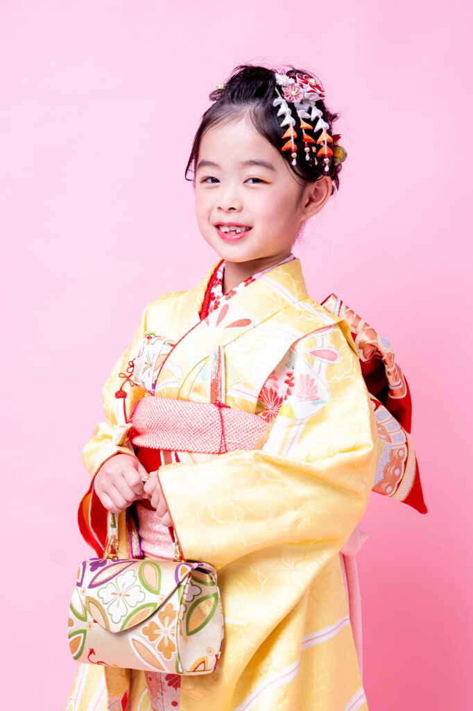 ライティングは今回は黄色いお着物にあわせてピンクの背景紙を選びました。